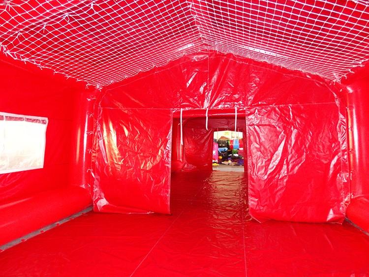 This is a sealed inflatable medical tent for refugee’s using, its with insect netting windows, and the sheet curtain can be roll and put down to cover the netting. We make the structure tubes by 0.6mm pvc tarpaulin with hot welded workmanship. And the cover sheet is 0.4mm pvc tarpaulin which is lead free, 100% water proof, flame retardant and UV resistant, the application for the inflatable emergency tent is to hold over 10 refugees and the top roof is with rope netting for lighting hanging, and its with air condition pipe that it can be offered heating as well.
